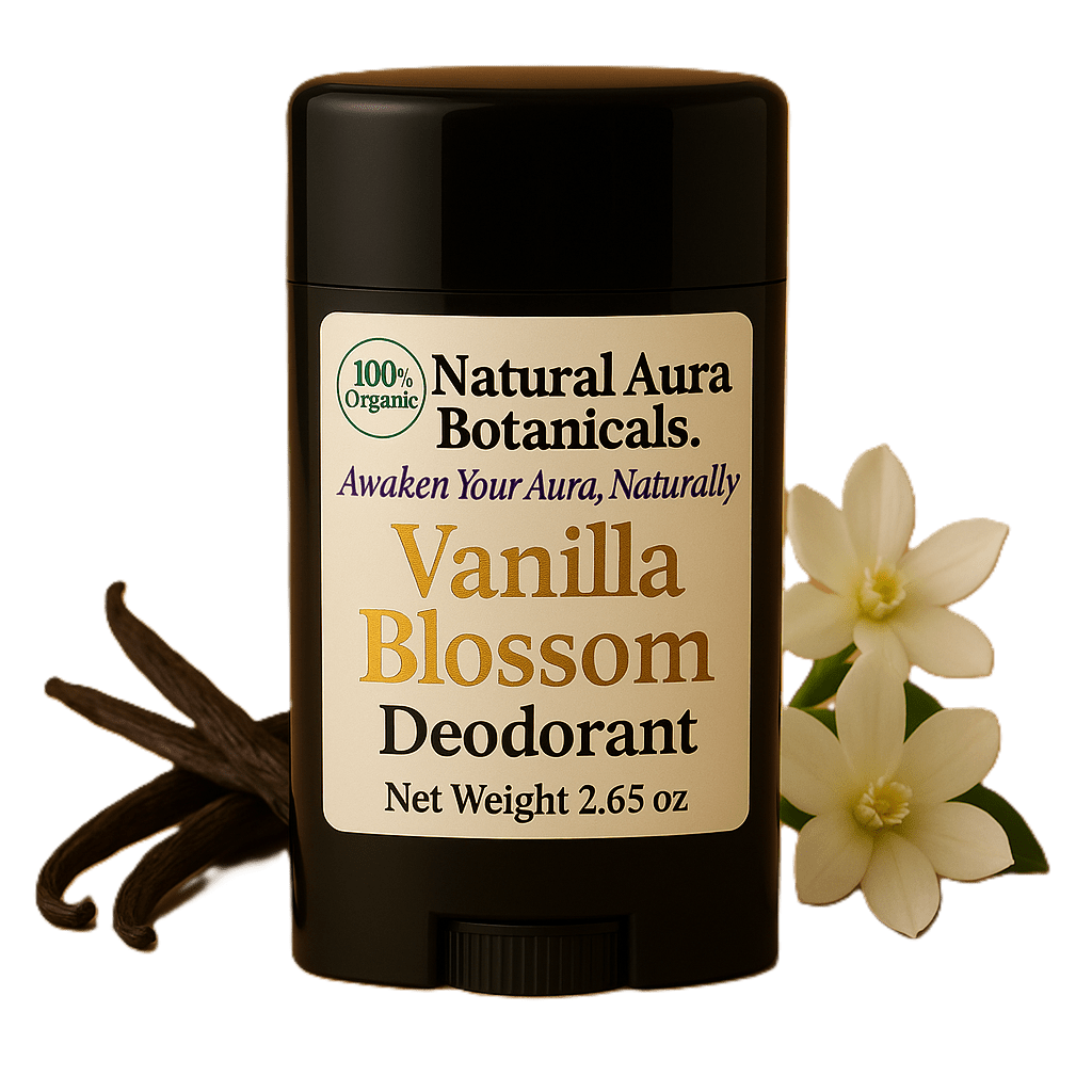 Designed for everyday use, Vanilla Blossom Deodorant layers beautifully with other body butters and fragrance oils in your collection, creating a complete natural scent experience. With sleek black packaging and a premium label, it embodies the elegance and refinement that Natural Aura Botanicals is known for.